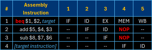In this example, the BEQ instruction’s conditional logic causes it to select the target instruction, making the two subsequent instructions – associated with not selecting the branch – irrelevant. The processor uses NOP to stall the pending instructions, choosing to load the target instruction instead. Then, in the following cycle, the processor flushes the skipped instructions.
