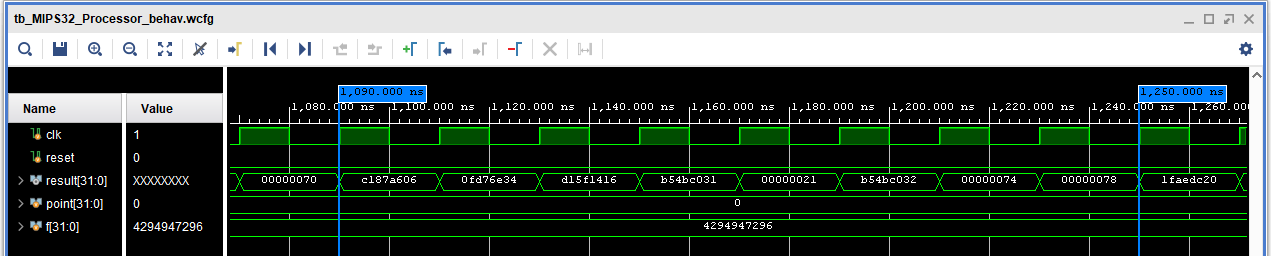 The testing process ran concurrently with development – testing the functionality of components, stages, etc. through test benches and manual signal manipulation in the Vivado Simulation environment – and culminated with the development of the tb_MIPS32_Processor.v test bench, included within this project’s repository.